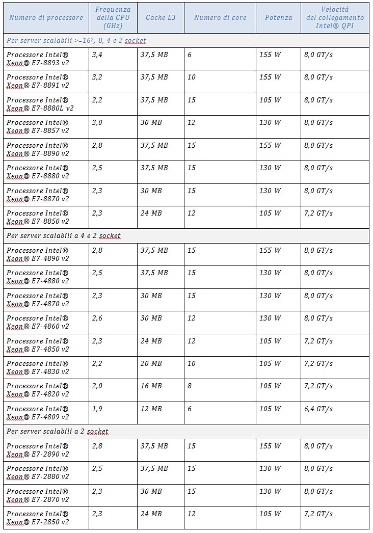 Per i sistemi a due Socket è disponibile la serie Xeon E7 2800 v2, per quelle a quattro Socket sono stati introdotti i modelli E7 4800 v2, mentre le CPU E7 8800 v2 sono progettate per server a otto Socket.
