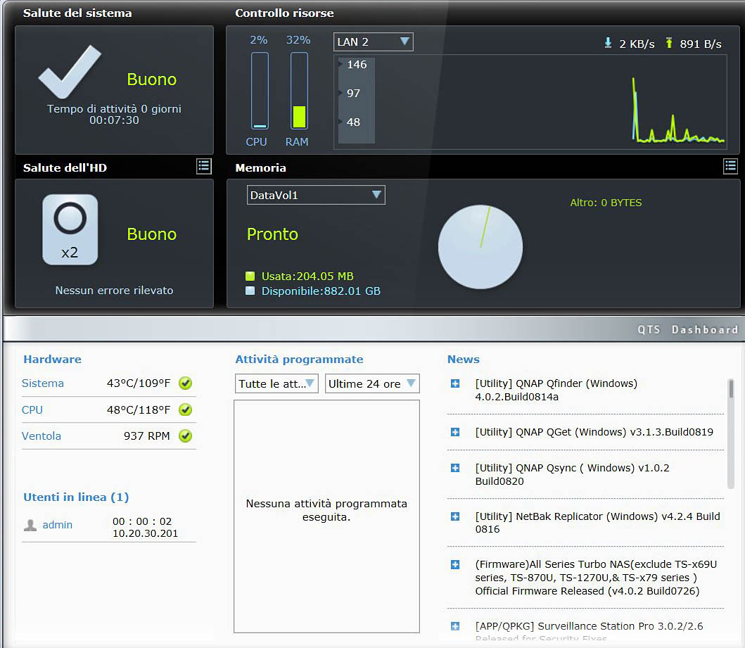 I tre desktop sono facilmente personalizzabili, mentre la dashboard dedicata riassume, in modo conciso e pratico, tutti gli aspetti fondamentali del NAS, gli allarmi, i possibili aggiornamenti, le temperature d’esercizio e molti altri parametri, indispensabili per gli amministratori e il personale tecnico.