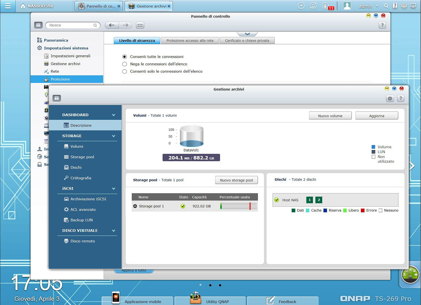 Alla prova dei fatti, il QNAP TS-269 PRO si è dimostrato particolarmente versatile e facile da configurare, anche per chi non possiede approfondite nozioni tecniche. Questo vale, almeno, per le fasi preliminari, di aggregazione al dominio e di configurazione standard. L’interfaccia QTS 4.x è infatti molto semplice da comprendere, dato che replica, in buona parte, quella di un comune desktop, con puntatore mouse, finestre ridimensionabili, menu e icone. Questo aspetto, che da tempo caratterizza l’offerta QNAP, è senza dubbio tra i più interessanti e costituisce una piccola rivoluzione nell’ambito NAS.