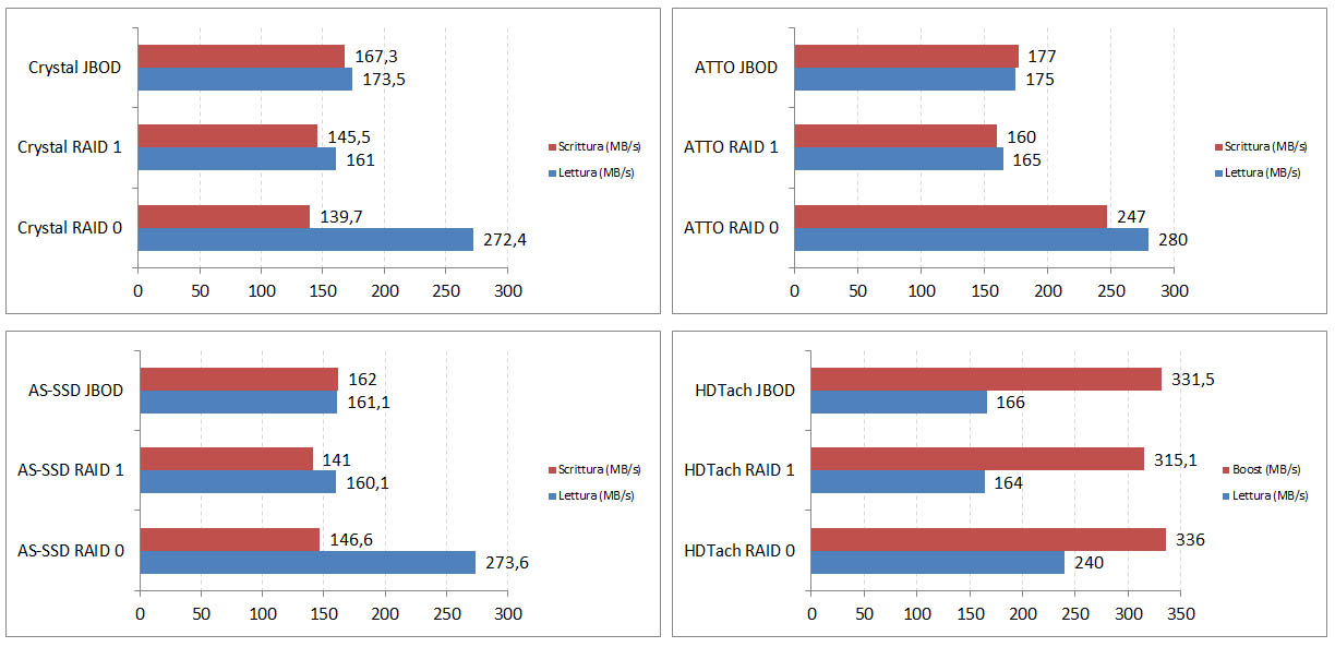 I test svolti in modalità RAID 1, tipicamente adottata per incrementare la sicurezza e non le performance, evidenziano un andamento prevedibile. In scrittura si raggiungono i 165 MB/s di picco, mentre in scrittura le misurazioni oscillano tra i 145 MB/s ei 164 MB/s. Valori solo leggermente superiori sono stati riscontrati in JBOD, con una lettura e una scrittura lineare dei dati che si attesta a circa 175 MB/s.