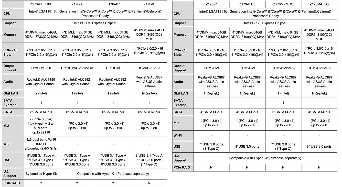 Tra i modelli più evoluti, la Z170-Deluxe include un adattatore wireless 3×3 802.11ac Wi-Fi e ulteriori connessioni M.2 per dispositivi di storage.