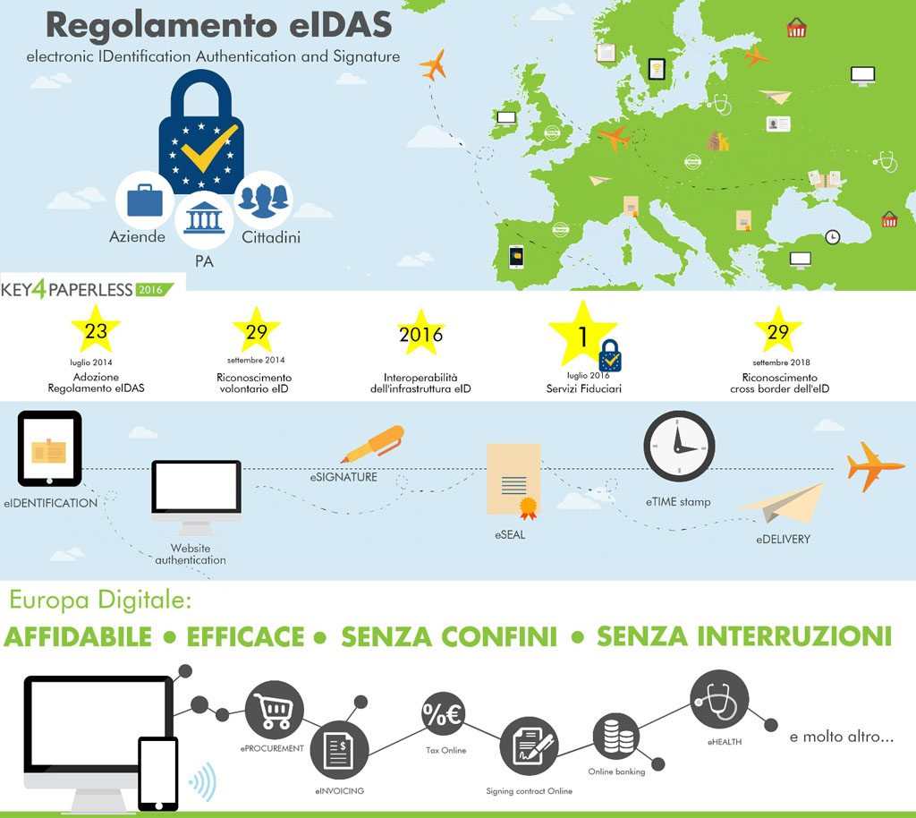 eIDAS, infatti, stabilisce le condizioni per il riconoscimento reciproco tra gli Stati Membri in ambito di identificazione elettronica e Servizi Fiduciari (traduzione di Trust Service). Regole comuni che garantiscono la piena interoperabilità a livello comunitario non solo della firma elettronica, ma anche dell’identificazione web dei cittadini (in Italia SPID) e dei servizi di terza parte (firme elettroniche, sigilli elettronici, validazione temporale, servizio elettronico di recapito e autenticazione dei siti web).