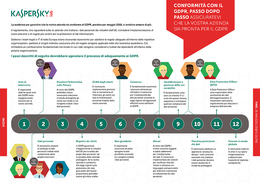 Il sito targato Kaspersky Lab è stato progettato proprio per rendere più chiare le responsabilità delle imprese e dei singoli dipendenti nell’ambito della nuova normativa; il tutto, attraverso un video animato, un diagramma interattivo e un whitepaper incentrato sull’impatto del GDPR sui reparti chiave dell’azienda. Si tratta di uno strumento di valutazione online pensato per le imprese che dovranno adeguarsi al GDPR nei tempi previsti: attraverso una serie di domande il sito aiuterà a valutare l’attuale stato di salute dei dati di tutta l’azienda e fornirà consigli importanti su come affrontare le modifiche chiave che li riguardano.