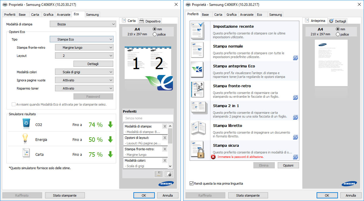I driver sono ben fatti, chiari da interpretare e ricchi di impostazioni e preset; interessante la funzione “ECO” che permette di abilitare differenti meccanismi per ridurre l’impatto ambientale (consumo carta, consumo toner e assorbimento energetico), con tanto di simulatore in grado di stimare il risparmio effettivo. (Clicca l’immagine per ingrandirla).