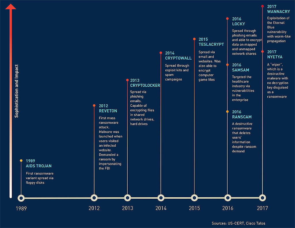 Seconda una recente ricerca targata Cisco, il ransomware costituisce ormai una delle principali minacce per il digital business. A livello globale, circa il 49% delle aziende hanno sperimentato almeno un cyber attacco ransom nel 2016, di cui il 39% sono stati attacchi ransomware. Solamente negli Stati Uniti, il numero di attacchi è aumentato del 300%, dal 2015 al 2016. Questo trend è legato alla crescita dei ransomware-as-a-service (RaaS) registrata nella prima metà del 2017, per i quali i criminali ingaggiano gli operatori di piattaforme RaaS per lanciare attacchi.