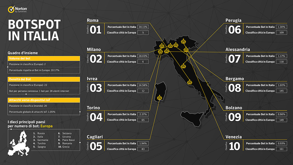 Con uno bot europeo ogni dieci ospitato nel Bel Paese, l’Italia si classifica come la seconda residenza preferita dai bot di tutta Europa. La presenza di un bot ogni 28 utenti internet, colloca invece il nostro Paese al 22° posto in Europa. Roma è la quinta città più popolare fra i bot europei: il 30,1% dei bot italiani originano dalla capitale; il 28% risiede invece a Milano.