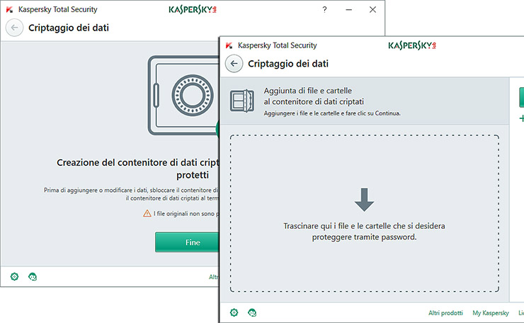 Con la funzione “Criptaggio dei dati” è possibile abilitare dei contenitori locali dove riporre file e cartelle che saranno successivamente cifrati tramite password e resi disponibili come unità disco addizionali. In caso di copia o rimozione del drive ad opera di terzi, tali file risulteranno illeggibili e perciò protetti. Il funzionamento è immediato, tramite drag’n’drop.