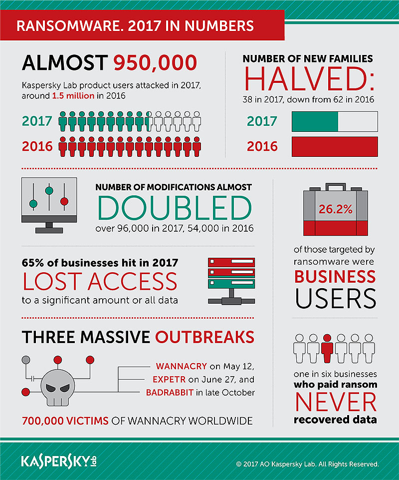 Il report Story of the Year 2017: Ransomware’s new menace targato Kaspersky Lab svela che, nel 2017, il 26,2% degli attacchi ransomware ha colpito utenti business, un dato in crescita rispetto al 22,6% del 2016. Secondo Kaspersky Lab, questo è dovuto in parte a tre attacchi senza precedenti, che hanno colpito le reti aziendali cambiando definitivamente il panorama di queste minacce. Il 2017 sarà infatti ricordato come l’anno in cui gli attacchi ransomware hanno subito un’improvvisa evoluzione con la serie di attacchi distruttivi WannaCry, del 12 maggio, ExPetr, del 27 giugno, e BadRabbit a fine ottobre.