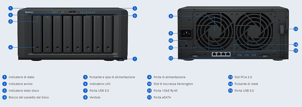 DS1817+ supporta fino a 18 unita con due unità di espansione Synology DX5172 collegate, consentendo un avvio ridotto e semplice per la scalabilità on-demand. Lo slot PCIe supporta la Scheda adattatore SSD PCIe M.2 opzionale M2D173 per slot SSD SATA dual M.2 da usare come cache SSD per migliorare notevolmente le prestazioni di archiviazione senza utilizzare i vani unità da 3,5″. Lo slot PCIe può essere usato anche per aggiornare DS1817+ con schede add-in di rete da 10GbE.
