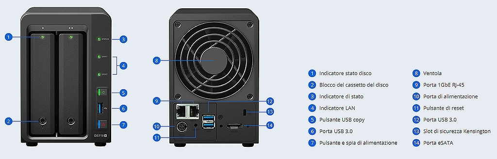 DS718+ è fornito di tre porte USB 3.0 e porte dual Gigabit LAN che supportano le modalità failover e Link Aggregation. Il DS718+ 2 bay supporta fino a 7 unità con unità di espansione Synology DX5172.