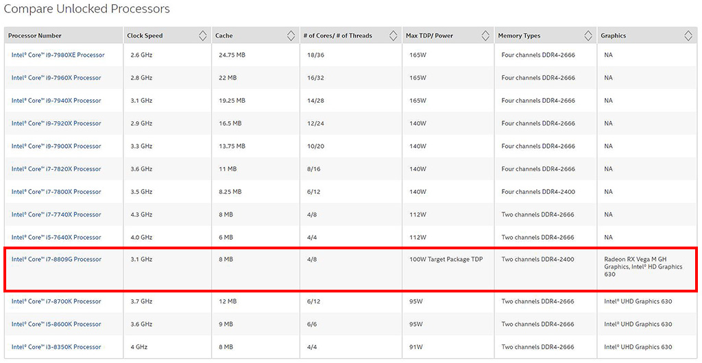 In pratica, accanto alla tradizionale GPU HD Graphics 630, il processore Core i7-8809G integra un controller per la memoria DDR4 a 2400 MHz e il chip Radeon RX Vega M GH, il tutto per un TDP di 100 W.