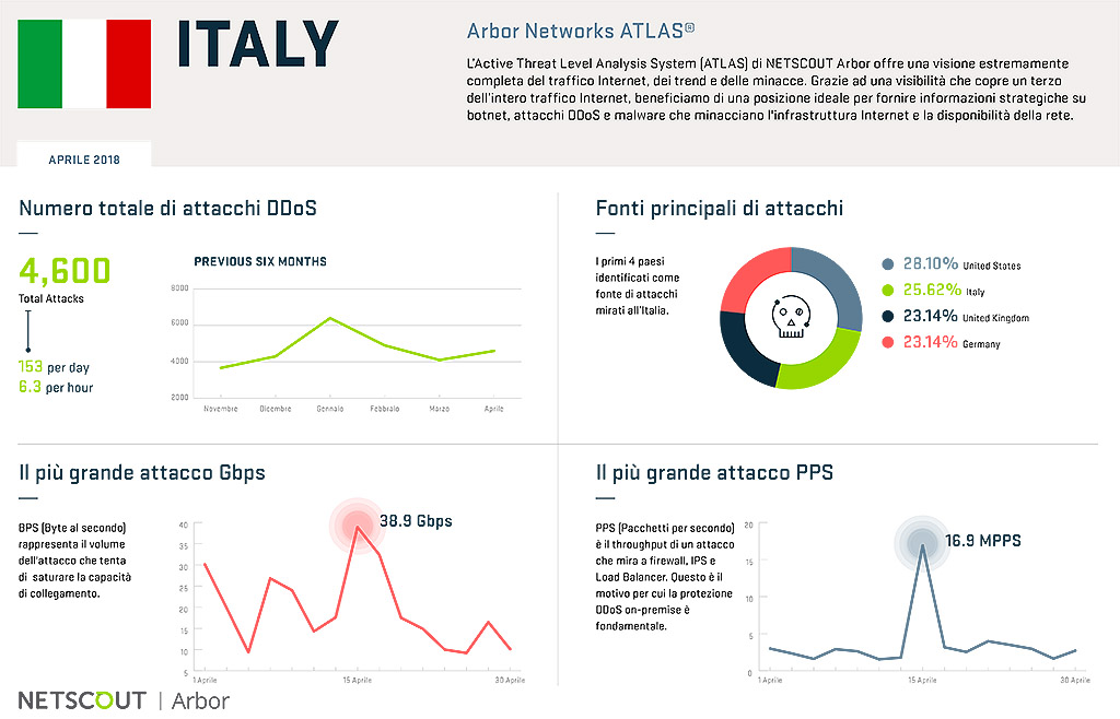 I dati rilevati da Atlas, piattaforma targata Netscout Arbor hanno confermato che nel nostro Paese nel mese passato ci sono stati 153 attacchi, spesso dall’estero. la piattaforma Atlas di Netscout Arbor in grado di raccogliere dati sul traffico anonimo da 400 service provider su scala globale, offrendo così la possibilità di osservare circa un terzo dell’intero traffico Internet, ha rilevato che nel solo mese di aprile di quest’anno sono stati registrati 4.600 attacchi informatici in Italia, con una media di circa 153 attacchi al giorno. Oltre il 28% di questi è stato sferrato dagli Stati Uniti, seguito dagli attacchi provenienti direttamente dall’Italia al 25,62%.
