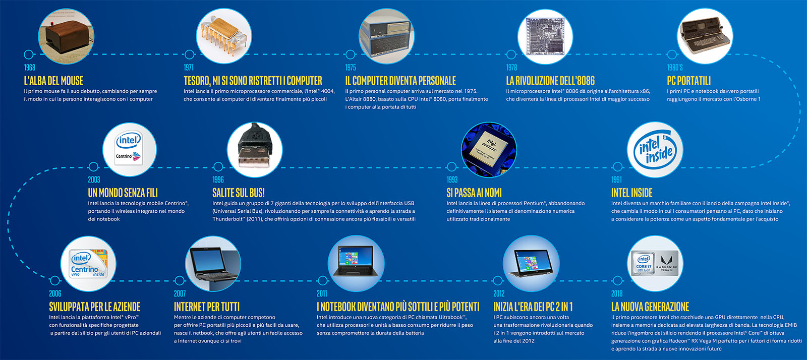 L’infografica racchiude i momenti salienti di questa storia, illustrando un percorso contraddistinto da concrete innovazioni che hanno rivoluzionato il modo di concepire il PC e aperto la strada a future evoluzioni tecnologiche.