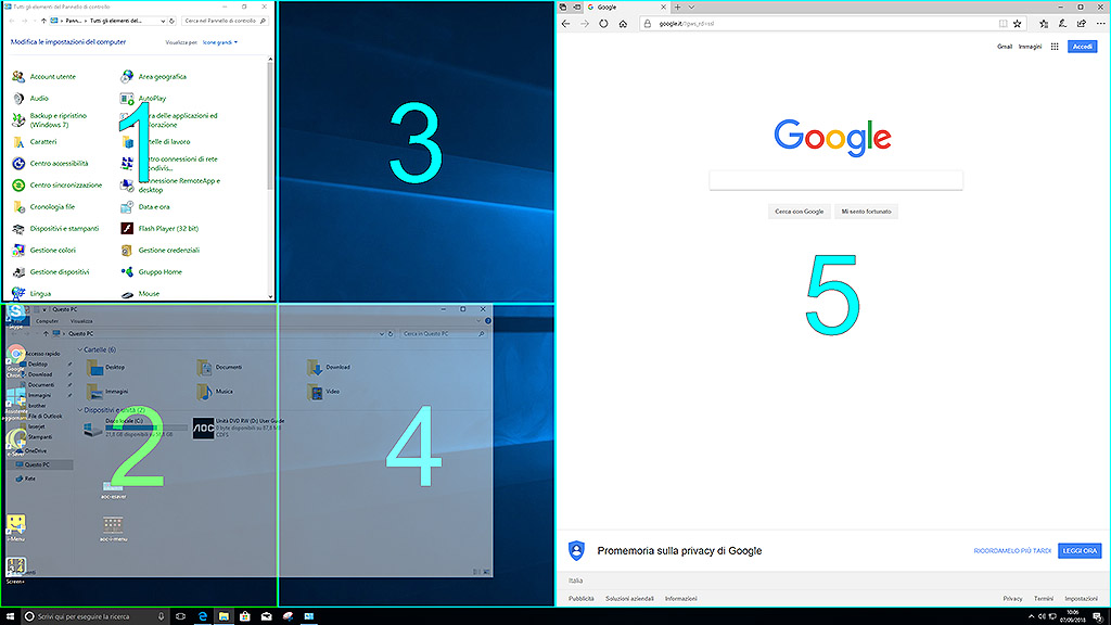 AOC Screen+ è invece un software pensato per accelerare la produttività multitasking. Attraverso una serie di maschere predefinite consente di posizionare rapidamente programmi, App e finestre sulla matrice prescelta, memorizzandone il posizionamento.