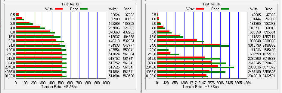 Le performance scendono sino a 505 MB/s in lettura e 451 MB/s in scrittura adottando AS SSD Bench, mentre si superano i 561 MB/s in lettura adottando pattern da 8 MByte ciascuno e blocchi da 256 MByte nella suite ATTO Disk Bench.