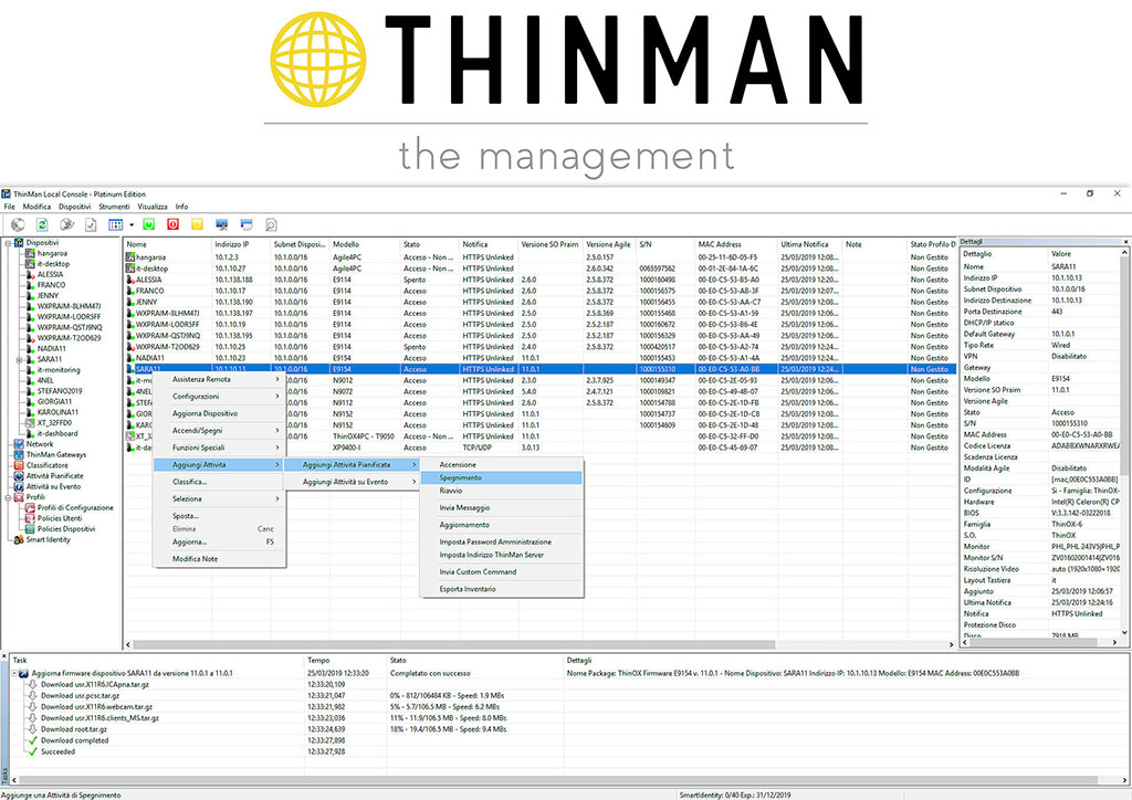 Come Vendor di soluzioni che agevolano l’utente ad adottare le giuste tecnologie per accedere al Cloud, siamo in grado di fornire svariate soluzioni software per la gestione degli endpoint.Come accennato precedentemente, ThinMan è la nostra console di gestione unificata degli endpoint dell’infrastruttura aziendale. Le parole chiave di ThinMan sono: organizzazione, grazie alla quale informazioni e configurazioni dei dispositivi sono sempre a portata di mano, gestione, in quanto in pochi clic si ha il pieno controllo del risparmio energetico, la Wake-On-Lan, gli aggiornamenti software e l’installazione e configurazione delle applicazioni per ogni singolo dispositivo o per gruppi e, infine, l’automazione, pianificando la distribuzione automatica delle configurazioni sugli endpoint, risparmiando così tempo, risorse e denaro, potendo sfruttare al massimo il ROI.A completamento di ThinMan, si trovano ThinMan Gateway in versione software, virtual appliance o hardware, per la gestione degli endpoint nelle sedi remote e nei branch office, così come ThinMan Smart Identity.