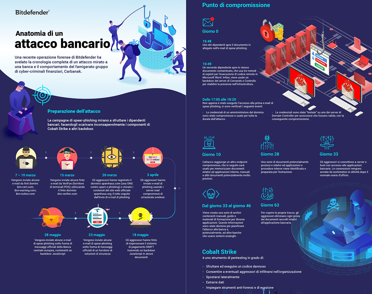Con un report dettagliato Bitdefender ha raccontato un attacco contro una banca europea, acquisendo nuove informazioni e creando cronologia completa dell’evento. L’analisi è partita dal momento in cui l’email di spear phishing ha raggiunto la casella di posta in entrata di un dipendente dell’ente colpito fino alla scoperta, mostrando come il famigerato gruppo Carbanak si infiltra all’interno delle aziende e come si sposta all’interno dell’infrastruttura.