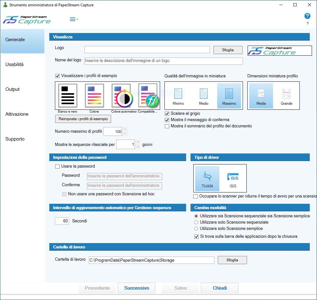 PaperStream può essere programmato a piacimento, definendo le routine di lavoro, i profili da visualizzare e utilizzare. I controlli granulari permettono di definire il grado di dettaglio delle miniature, l’inserimento di una eventuale password o l’utilizzo di driver TWAIN o ISIS. La qualità dell’output, il formato e la cartella di salvataggio delle scansioni sequenziali possono essere liberamente impostati dall’utente.
