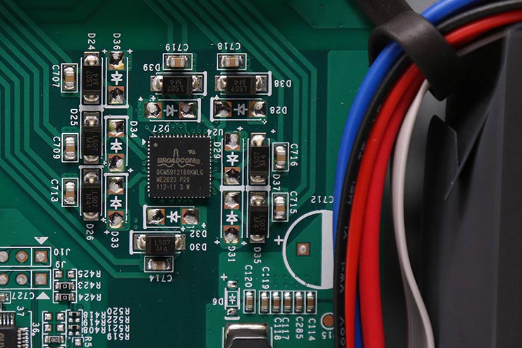 Il chip Realtek RTL8214FC è un ricetrasmettitore full duplex che opera quale gestore delle funzioni fisiche PHY.