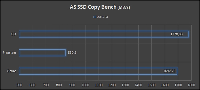 AS SSD evidenzia un livello di performance superiore a molti drive della medesima fascia di mercato, con 2,9 GB/s in lettura e 2,3 GB/s in scrittura.