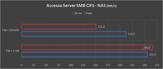Se usato come file server e repository per backup, il NAS offre elevate velocità, con oltre 255 MB/s in scrittura file. L’adozione di file più piccoli (tra 10 KByte e 100 MByte), porta la velocità generale a 212 MB/s in scrittura e 151 MB/s (in lettura).