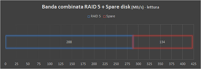 La banda combinata misurata raggiunge dunque i 422 MB/s in lettura e sfiora i 441 MB/s in scrittura.
