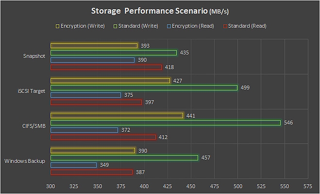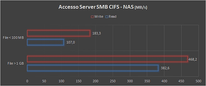Le prestazioni in modalità di condivisione cartella SMB / CIFS per ambienti di rete misti evidenza un ottimo comportamento con file di grosse dimensioni, con oltre 468 MB/s in scrittura file. L’adozione di file più piccoli (tra 10 KByte e 100 MByte), porta la velocità generale a 183,3 MB/s in scrittura e 107 MB/s (in lettura).
