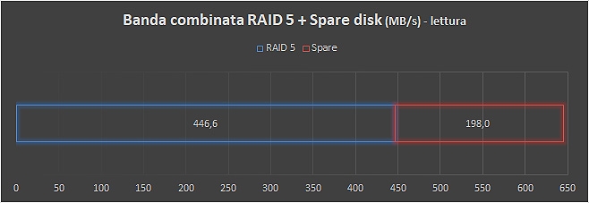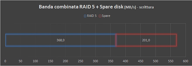 L’array RAID è in grado di sfruttare le potenzialità della singola connessione 10 GbE, con velocità in lettura di 531,2 MB/s e un picco di performance in scrittura di 701,6 MB/s.