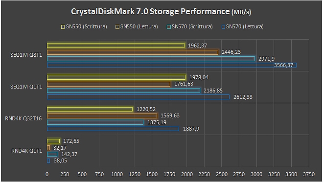 Nel confronto con la generazione passate SN550, il nuovo SN570 si è dimostrato generalmente più rapido, con velocità di picco superiori del 45% e 60% in scrittura e lettura lineare.