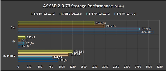 ASS SSD rileva invece un andamento non sempre lineare e registriamo velocità superiori nella versione SN550, per esempio in modalità 4K e 4K-64Thrd, oppure nella gestione di ISO e App.