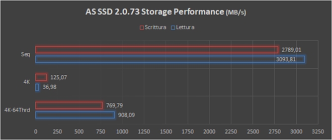 AS SSD 2.0 evidenzia 3,09 GB/s in lettura sequenziale e 2,78 GB/s in scrittura, con un calo a 908 MB/s e 769 MB/s in lettura e scrittura in modalità di blocco 4K-64Thrd.
