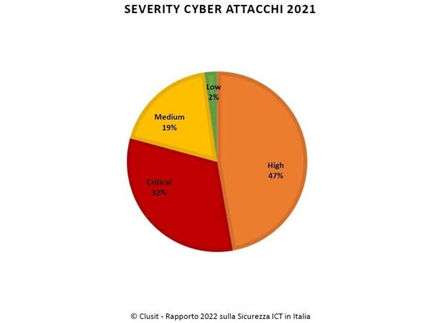 Lo scorso anno, segnala il Clusit, il 79% degli attacchi rilevati ha avuto un impatto elevato, contro il 50% dello scorso anno. In dettaglio, il 32% è stato caratterizzato da una severità critica e il 47% alta. A fronte di queste percentuali, sono diminuiti invece gli attacchi di impatto medio (-13%) e basso (-17%).