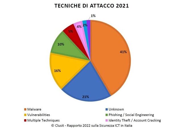 Non sorprende quindi che il malware, in particolare il citato ransomware, continui ad essere lo strumento preferito per gli attacchi informatici: nel 2021 ha rappresentato, come nel 2020, il 41% delle tecniche utilizzate per un cyber attacco. Le tecniche unknown, ovvero non identificate, sono state utilizzate nel 21% degli attacchi (in particolare nei casi di data breach). A seguire, i cybercriminali hanno sfruttato vulnerabilità note (16% dei casi) e tecniche di Phishing/Social Engineering (10% degli attacchi).