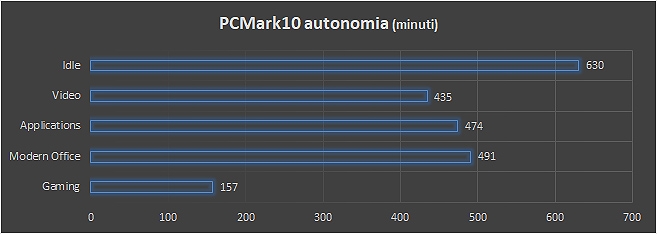 Le prestazioni generali rilevate con PCMark10 evidenziano la capacità del sistema di assolvere senza problemi a compiti d’ufficio, anche in ambiente multitasking e con l’avvio e gestione di videochiamate, streaming video, navigazione, stesura testi.