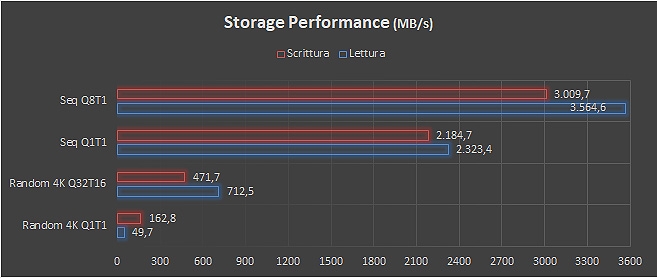 Lo storage interno PCIe 3.0 offre performance da primato con lettura e scrittura lineare fino a 3,56 GByte/s e 3 GByte/s, rispettivamente. Ampio merito della fluidità di lavoro è da imputare al comparto solid state, che permette di avviare il PC in 12 secondi. Il recovery da standby è pressoché istantaneo, mentre per un reboot completo occorrono, in media, 31 secondi.