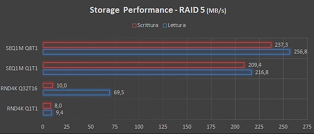 Il sistema offre una buona velocità generale nella maggior parte dei contesti, dalla copia su script, alla replica, alla gestione degli snapshot. La connessione a 2,5 GbE consente di esprimere il potenziale della configurazione, che raggiunge i 258 MB/s in lettura sequenziale e i 237 MB/s in scrittura.