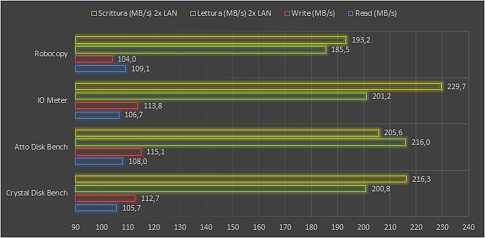 Le performance in single LAN raggiungono il limite imposto dal tipo di connessione, con velocità di oltre 100 MB/s in lettura e scrittura. Aggregando le due LAN è possibile trarre maggiore vantaggio dalle potenzialità della CPU integrata. Durante le prove abbiamo registrato performance variabili tra i 193 e 229 MB/s in scrittura e tra 185 e 216 MB/s in lettura.