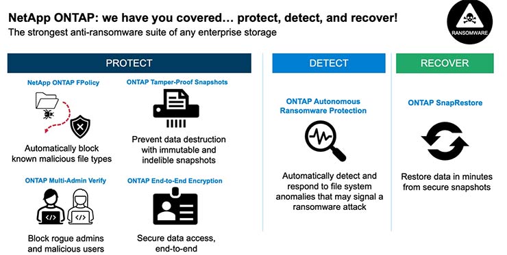 Consapevole del delicato momento globale, NetApp ha presentto Ransomware Recovery Guarantee. L’azienda punta sull’estrema efficacia delle funzionalità integrate e della protezione dai ransomware del proprio ambiente ONTAP. La piattaforma è in grado di bloccare automaticamente i tipi di file dannosi individuati, di bloccare gli amministratori disonesti e gli utenti malintenzionati con la verifica multi-amministratore e di fornire snapshot a prova di manomissione che non possono essere eliminati, nemmeno dall’amministratore dello storage.