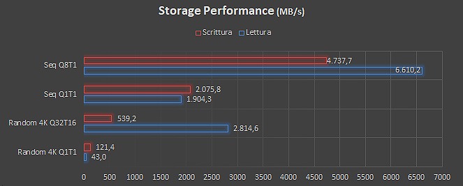 L’architettura storage di serie prevede 3 slot M.2 totale e lo spazio per i drive Serial Ata da 2,5” o 3,5”. Le configurazioni più estese possono arrivare ad accogliere sino a 11 drive, che possono essere gestiti in modalità RAID 0, 1, 10, 5 su M.2 e RAID 0, 1 e 5 su canali seriali. Nel nostro caso è stato installato un modello Micron MTFDKBA1T0TFH da 1 TByte.