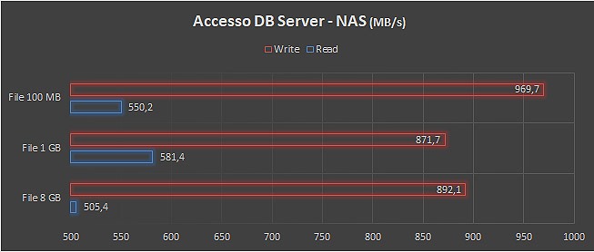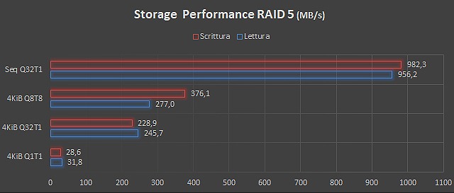 L’array RAID è in grado di sfruttare le potenzialità della singola connessione 10 GbE, con velocità in lettura di 956,2 MB/s e di 982,3 MB/s in scrittura.