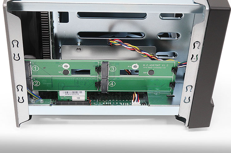 AS6804T può ospitare fino a quattro drive Serial Ata 3 con dimensioni standard da 3,5” e 2,5”, oltre ad altrettanti drive NVMe, grazie alla scheda interna dedicata su bus PCI Express 4.0 x4.