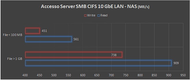 Se usato come file server e repository per backup, il NAS offre elevate velocità, con oltre 692 MB/s in scrittura file. L’adozione di file più piccoli (tra 10 KByte e 100 MByte), porta la velocità generale a 510 MB/s in scrittura e 629 MB/s (in lettura).