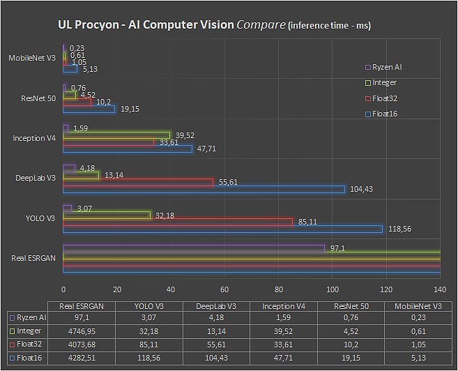 La NPU AMD ha mostrato buone qualità nei test di machine vision con tempi di generazione generalmente contenuti nel testo UL Procyon: