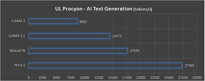 La generazione di testi fatto registrare sino a 27.390 token/s con Phi, un valore che scende a 17.636 token/s con Mistral e scende progressivamente con Llama3 e 2: