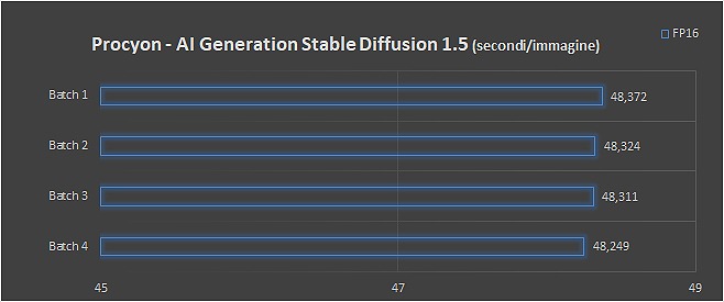 Lavorando con Stable Diffusion 1.5 per la generazione immagini si ottengono performance entro i 48 secondi circa per tutti i batch, con parametri standard.