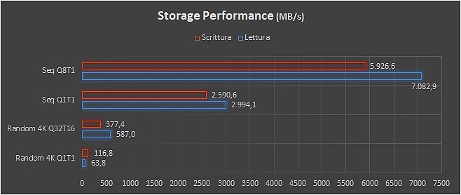 Lo storage M.2 interno è certamente l’asso nella manica di questa configurazione. Grazie a un bus PCIe x4 è in grado di raggiungere prestazioni lineari in lettura di 7 GB/s e lavorare con schemi di accesso casuali complessi con velocità superiori ai 580 MB/s. Questo si traduce in una reattività generale molto alta, software gestiti rapidamente e tempi di avvio del sistema ridotti (14,7 secondi).